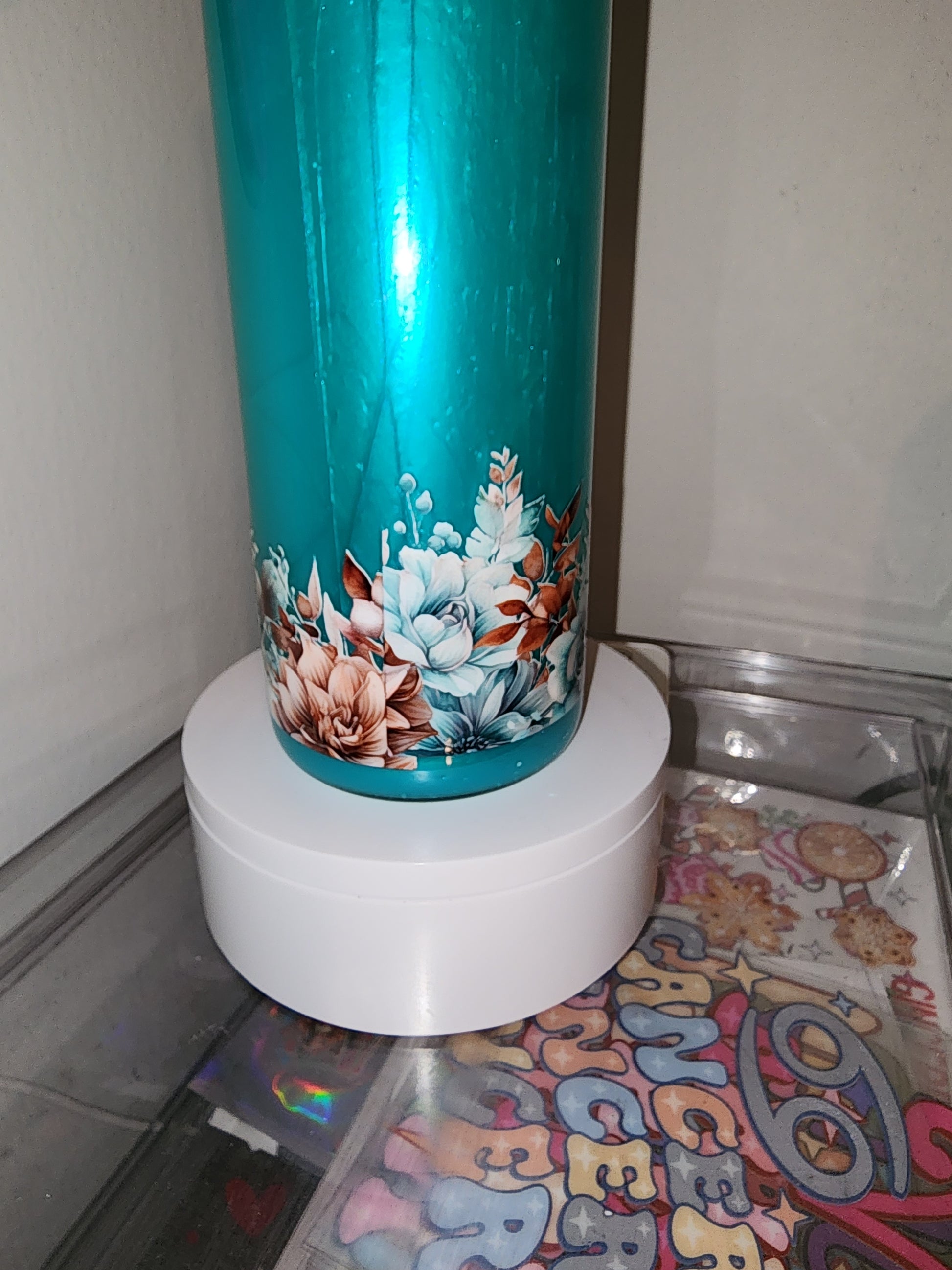 25 oz glass. Mica powder. Decal isn't on perfectly straight.