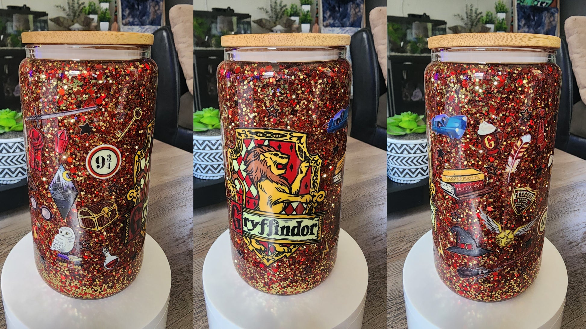 16 oz glass snow globe. Suspended glitter.
