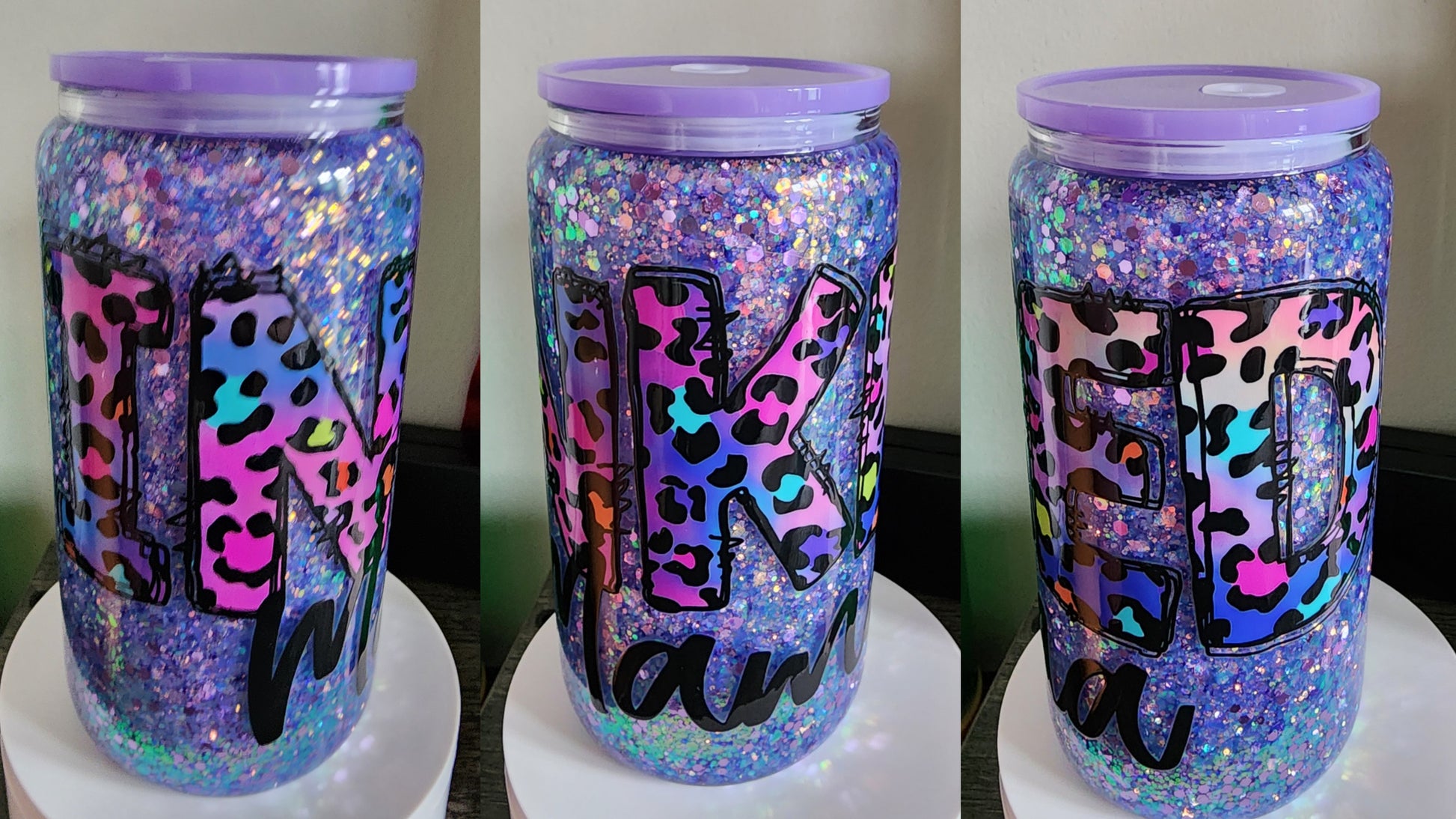 16 oz glass. Suspended glitter.