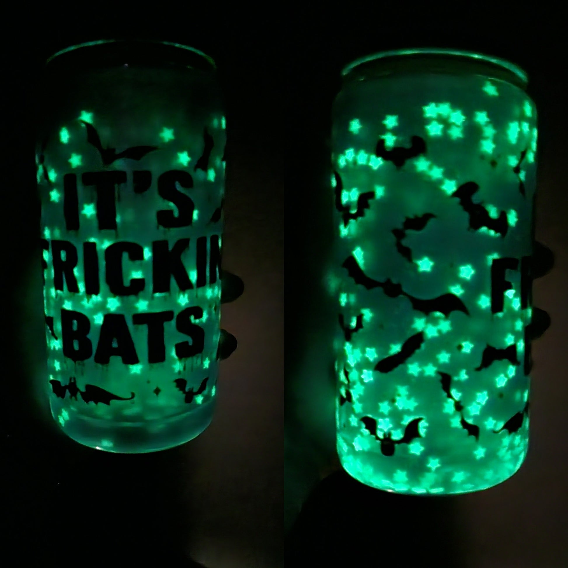 16 oz glass. Glows in the dark! discounted because it's out of season now!